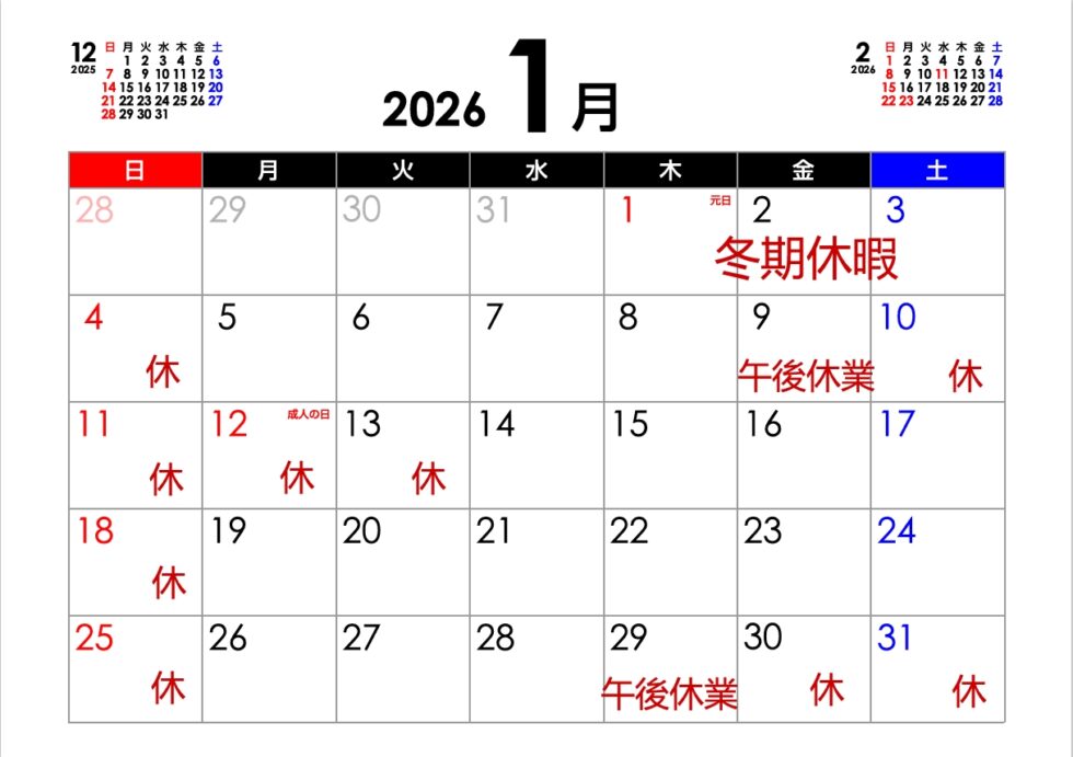 1月10日(土)、13日(火)、30日(金)、31日(土)終日休業